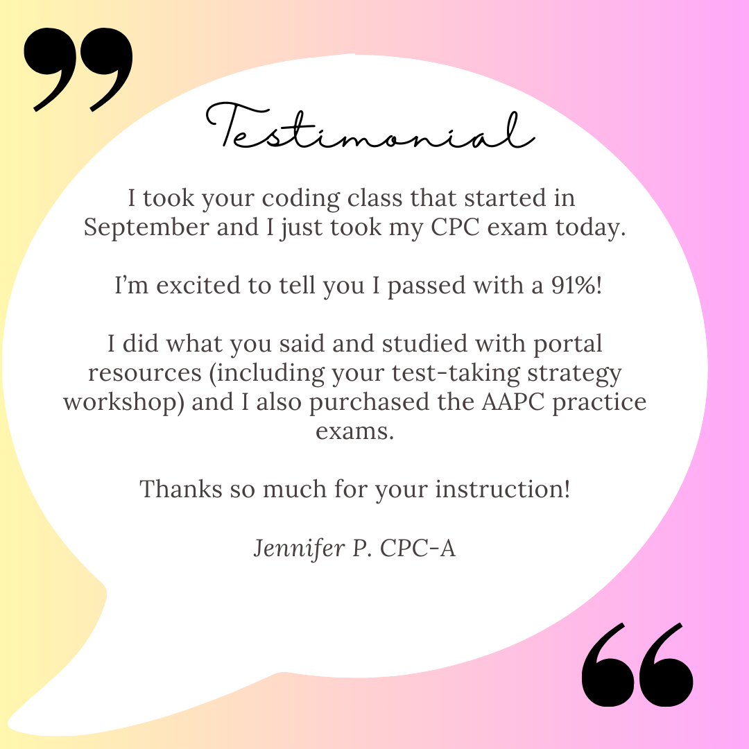 Yes! This program prepares you to take (and pass!) the AAPC’s Certified Professional Coder (CPC) exam. You’ll learn ICD-10-CM and CPT, HCPCS coding, how to use your coding books effectively, and test taking strategies.. You’ll also get my exclusive bonus content, including CPT highlighting tips and real-time Q&A sessions—to help you feel fully prepared.